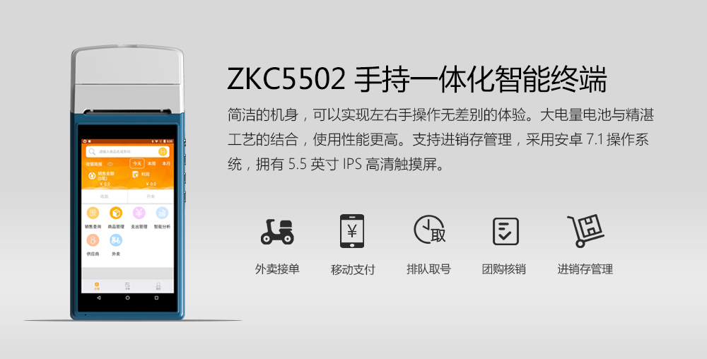 智谷聯(lián)ZKC5502手持收銀機(jī)融合了收款支付與大屏PDA的各項(xiàng)功能,超高的集成度和便攜性,可隨時(shí)隨地提供集強(qiáng)大計(jì)算、安全支付、4G網(wǎng)絡(luò)、高速打印、快速數(shù)據(jù)采集和信息訪問功能于一體的產(chǎn)品應(yīng)用解決方案,廣泛應(yīng)用于奶茶、咖啡、烘焙店、快餐、小吃、餐飲店、便利店、酒店、美容院等實(shí)體商戶領(lǐng)域。