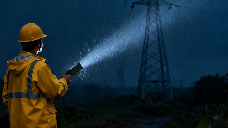 電力人員冒雨持手電照桿塔,光束穿透雨幕
