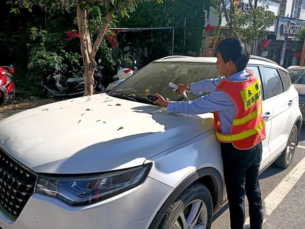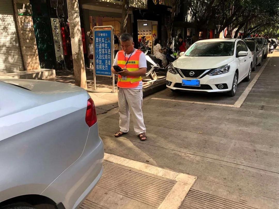 如圖所示,在永善縣街道車輛規(guī)范停在劃定的臨時(shí)停泊位內(nèi),收費(fèi)員正拿著 PDA 手持終端機(jī),對(duì)前來臨時(shí)停泊的車輛車牌進(jìn)行掃描,將車輛信息傳遞給后臺(tái)管理終端,并打印出道路臨時(shí)停車入場(chǎng)小票放到車輛擋風(fēng)玻璃左下角顯眼位置,小票上面有車牌號(hào)、停泊路段、進(jìn)場(chǎng)時(shí)間、二維碼、聯(lián)系方式等內(nèi)容。