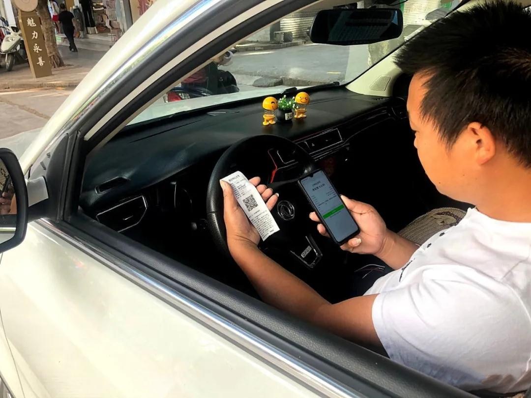 離開的車主正在用手機(jī)掃描入場(chǎng)小票上的二維碼。